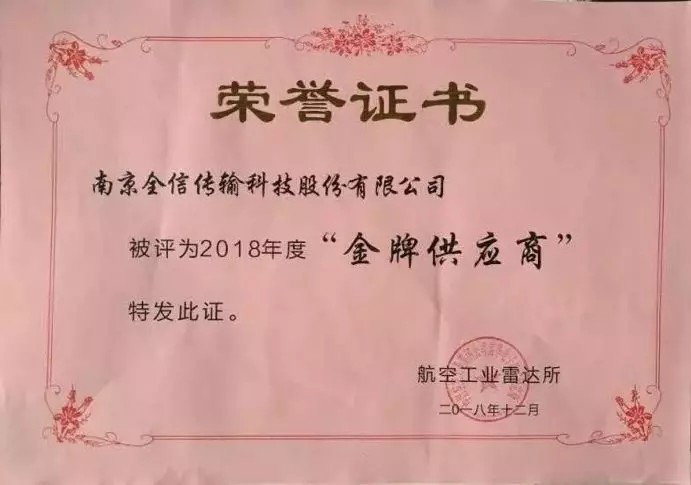 在剛剛過去的由中國航空工業集團公司雷華電子技術研究所(以下簡稱中航607所)召開的供應商績效綜合評價會上,全信股份榮獲“2018年度金牌供應商”稱號。