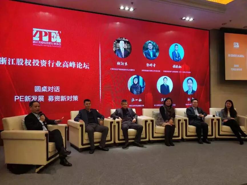 在圓桌沙龍環節,我司何董作為“PE新發展、募資新對策”沙龍主持人對話中銀投資浙商產業基金總經理錢曉楓、浙商創投行政總裁華曄宇、中新力合副總裁陳一梅、浙商創新資本總經理龔伯勇、