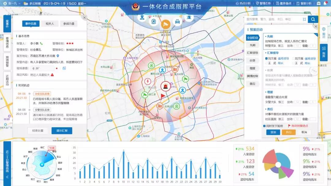 以松江分局為例,產品覆蓋常態指揮、應急指揮和大保指揮三大場景,滿足了公安“一屏觀天下、一網治全城”的需求。同時,其橫向聯動幾乎所有警務部門,縱向貫通派出所以及其下屬最基礎的職能機構,真正實現了跨層級、跨警種的合成作戰。